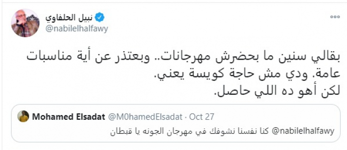 وكتب الحلفاوي، عبر موقع "تويتر" ردا على متابع تمنى رؤيته في مهرجان الجونة: "بقالي سنين مبحضرش مهرجانات.. بعتذر عن أية مناسبات عامة.. ودي مش حاجة كويسة يعني.. لكن أهو ده اللي حاصل".