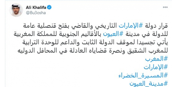 علق الإعلامي الإماراتي علي خليفة، اليوم، على اعتزام الإمارات فتح قنصلية لها في الصحراء الغربية بالمغرب.