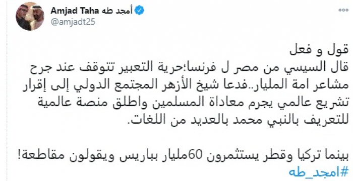 وكتب في تغريدة عبر "تويتر" رصدها "المشهد العربي": "قول وفعل قال السيسي من مصر لفرنسا؛حرية التعبير تتوقف عند جرح مشاعر أمة المليار.. فدعا شيخ الأزهر المجتمع الدولي إلى إقرار تشريع عالمي يجرم معاداة المسلمين وأطلق منصة عالمية للتعريف بالنبي محمد بالعديد من اللغات. بينما تركيا وقطر يستثمرون 60مليار بباريس ويقولون مقاطعة".