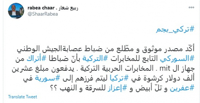 وقال في تغريدة عبر "تويتر" رصدها "المشهد العربي": "أكّد مصدر موثوق ومطّلع من ضباط عصابة الجيش الوطني السوركي التابع للمخابرات التركية بأنّ ضباطا أتراك من جهاز ال mit . المخابرات الحربية التركية. يدفعون مبلغ عشرين ألف دولار كرشوة في تركيا ليتم فرزهم إلى سورية في عفرين وتلّ أبيض وإعزاز للسرقة والنهب؟".