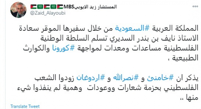 وقال في تغريدة عبر "تويتر" رصدها "المشهد العربي": "المملكة العربية السعودية من خلال سفيرها الموقر سعادة الاستاذ نايف بن بندر السديري تسلم السلطة الوطنية الفلسطينية مساعدات ومعدات لمواجهة كورونا والكوارث الطبيعية".