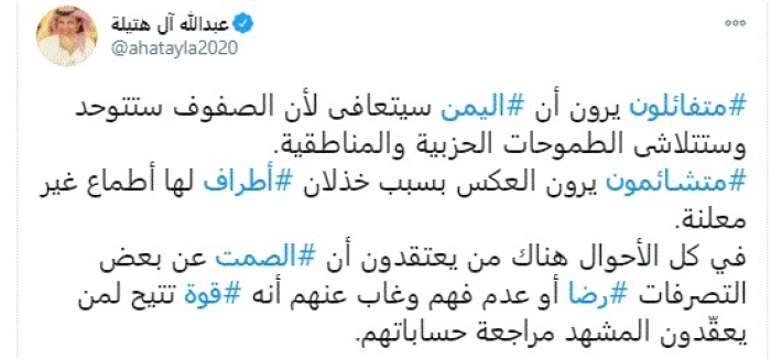 وجه الكاتب السعودي عبدالله آل هتيلة، اليوم، رسالة نارية لبعض القيادات بحكومة الشرعية، مؤكدًا أن الصمت عن بعض التصرفات قوة تتيح لمن يعقّدون المشهد مراجعة حساباتهم.