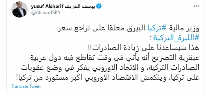 علق الكاتب الصحفي المتخصص بالشأن التركي يوسف الشريف، اليوم، على تصريحات وزير الخزانة والمالية التركي بيرات البيرق بشأن تراجع سعر الليرة التركية.
