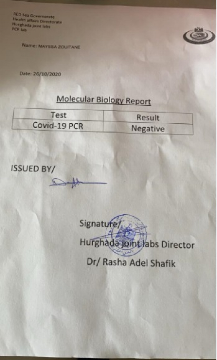 وجاءت نتيجة التحليل سلبية بعد الفحص.