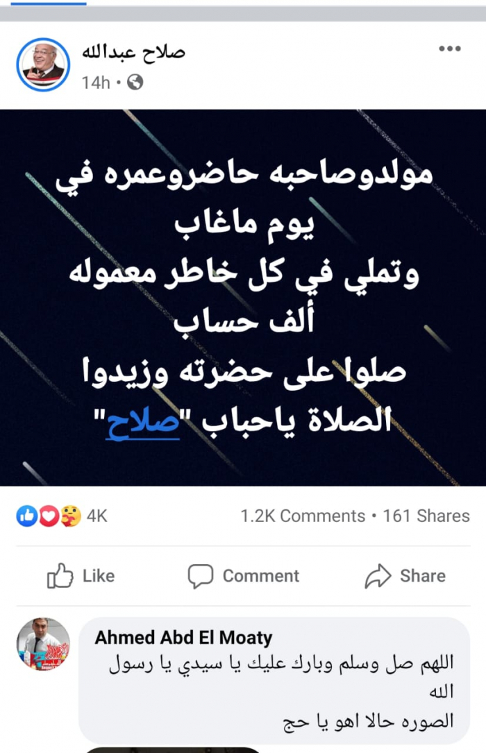وكتب صلاح عبد الله، بيت شعر عبر حسابه على "فيس بوك"، قائلاً: "مولد وصاحبه حاضر، وعمره في يوم ما غاب، وتملي في كل خاطر.. معموله ألف حساب، صلوا على حضرته..وزيدوا الصلاة يا أحباب".