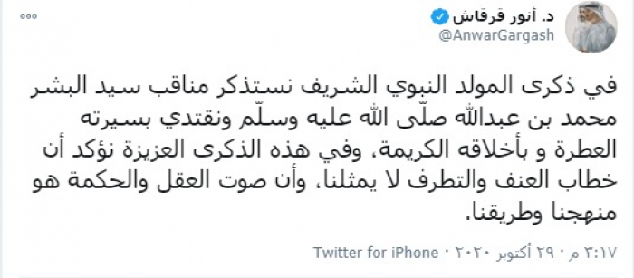 أحيا وزير الدولة الإماراتي للشؤون الخارجية الدكتور أنور قرقاش، ذكرى المولد النبوي الشريف بكلمات مُعبرة تحمل معاني السلام، داعياً إلى الاقتداء بأخلاق النبي محمد، مؤكداً أن خطابات التحريض على العنف والكراهية لا تمثل الإسلام.