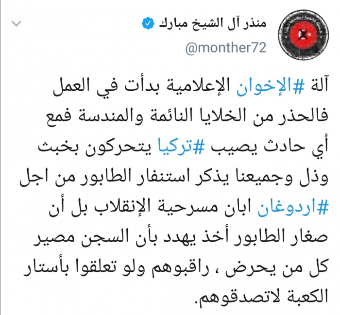 فضح المدون السعودي منذر آل شيخ المبارك، آلة الإخوان الإعلامية وقال إنها بدأت في العمل وطالب بالحذر منها.