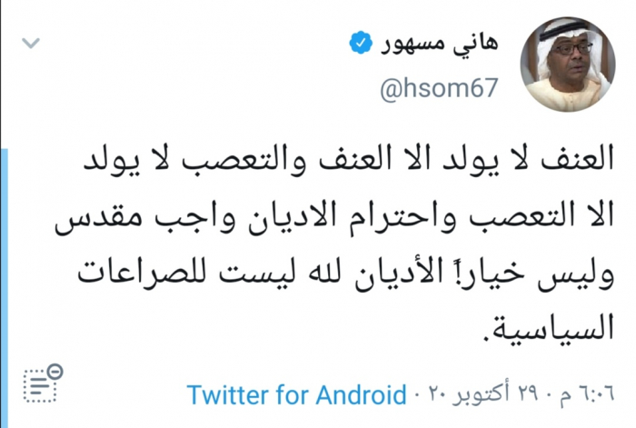 وكتب مسهور في تغريدة له على "تويتر" رصدها " المشهد العربي":" العنف لا يولد إلا العنف والتعصب لا يولد إلا التعصب واحترام الأديان واجب مقدس وليس خيارا الأديان لله ليست للصراعات السياسية".
