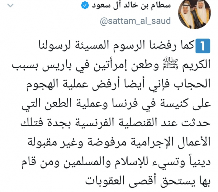 أعلن الأمير السعودي سطام بن خالد آل سعود، رفضه لعملية الطعن التي حدثت بالقنصلية الفرنسية في جدة، كما رفض الإساءة للنبي محمد وحادث طعن امرأتين بباريس.