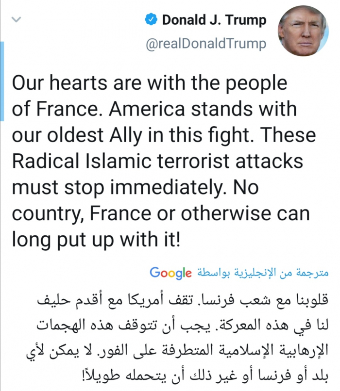 وكتب ترامب في تغريدة له عبر حسابه بتويتر ورصدها "المشهد العربي" قائلاً: "قلوبنا مع شعب فرنسا. تقف أمريكا مع أقدم حليف لنا في هذه المعركة. يجب أن تتوقف هذه الهجمات الإرهابية الإسلامية المتطرفة على الفور. لا يمكن لأي بلد أو فرنسا أو غير ذلك أن يتحمله طويلاً".