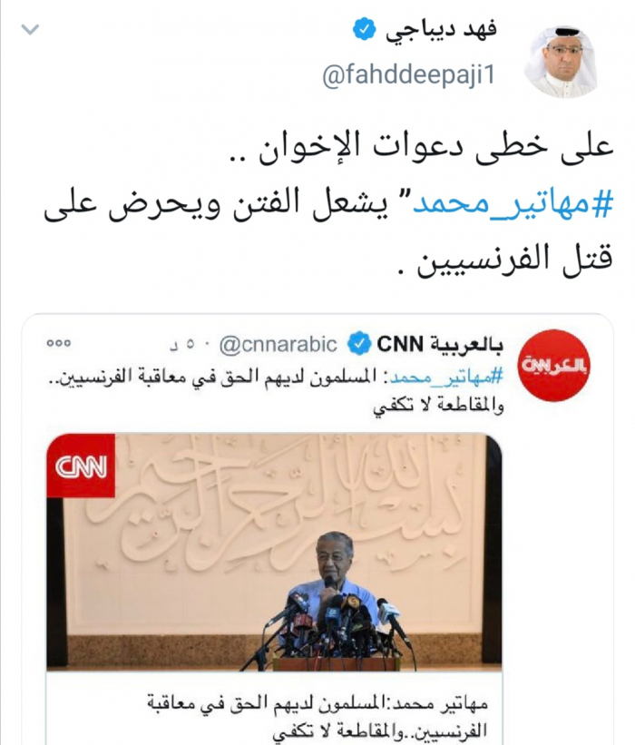 وغرد ديباجي عبر حسابه في تويتر ورصدها "المشهد العربي" قائلاً: "على خطى دعوات الإخوان .. مهاتير محمد يشعل الفتن ويحرض على قتل الفرنسيين".