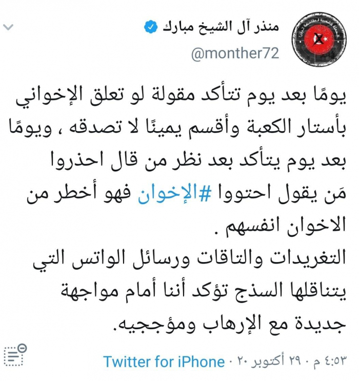 وكتب آل شيخ المبارك عبر تغريدة له على "تويتر" رصدها " المشهد العربي" :"يومًا بعد يوم تتأكد مقولة لو تعلق الإخواني بأستار الكعبة وأقسم يمينًا لا تصدقه، ويومًا بعد يوم يتأكد بعد نظر من قال احذروا مَن يقول احتوا الإخوان فهو أخطر من الاخوان أنفسهم".