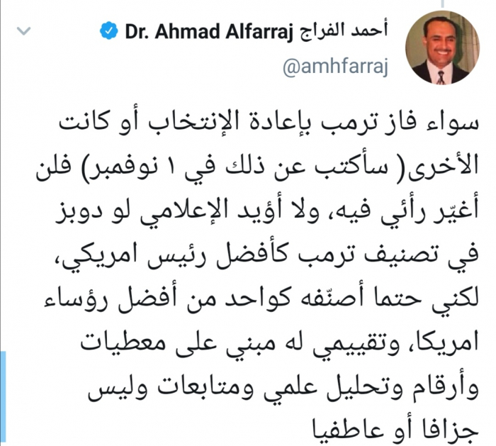 وقال الفراج عبر تغريدة له على حسابه بتويتر ورصدها "المشهد العربي" : "سواء فاز ترمب بإعادة الإنتخاب أو كانت الأخرى( سأكتب عن ذلك في ١ نوفمبر) فلن أغيّر رأئي فيه، ولا أؤيد الإعلامي لو دوبز في تصنيف ترمب كأفضل رئيس أمريكي".