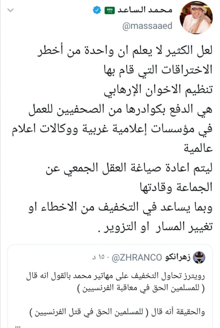 كشف الكاتب السعودي محمد الساعد، واحدة من أخطر الاختراقات التي قام بها تنظيم الاخوان الإرهابي، وهو العمل الإعلامي لعناصرها في المؤسسات الغربية.