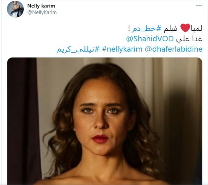 ونشرت "نيللي"، عبر "تويتر"، صورة لها من الفيلم وعلقت قائلة: "لميا.. خط دم.. على شاهد".