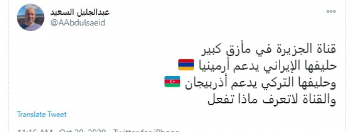 وقال في تغريدة عبر "تويتر" رصدها "المشهد العربي": "قناة الجزيرة في مأزق كبير حليفها الإيراني يدعم أرمينيا وحليفها التركي يدعم أذربيجان والقناة لا تعرف ماذا تفعل".