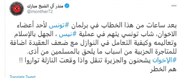 وقال في تغريدة عبر "تويتر" رصدها "المشهد العربي": "بعد ساعات من هذا الخطاب في برلمان تونس لأحد أعضاء الاخوان، شاب تونسي يتهم في عملية نيس، الجهل بالإسلام وتعاليمه وكيفية التعامل في النوازل مع ضعف العقيدة اضافة للمتاجرة الحزبية من اسباب ما يلحق بالمسلمين من أذى".