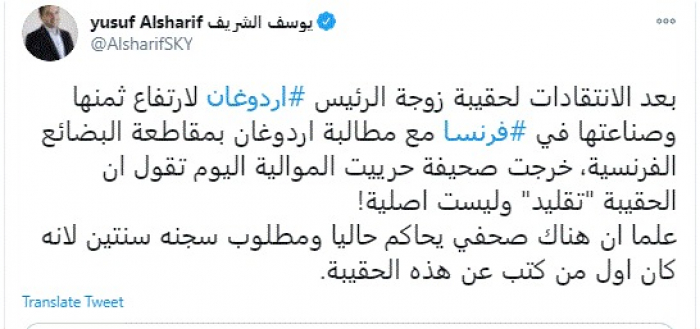 وقال في تغريدة عبر "تويتر" رصدها "المشهد العربي": "بعد الانتقادات لحقيبة زوجة الرئيس أردوغان لارتفاع ثمنها وصناعتها في فرنسا مع مطالبة أردوغان بمقاطعة البضائع الفرنسية، خرجت صحيفة حرييت الموالية اليوم تقول أن الحقيبة تقليد وليست أصلية! علمًا أن هناك صحفي يحاكم حاليا ومطلوب سجنه سنتين لأنه كان أول من كتب عن هذه الحقيبة".