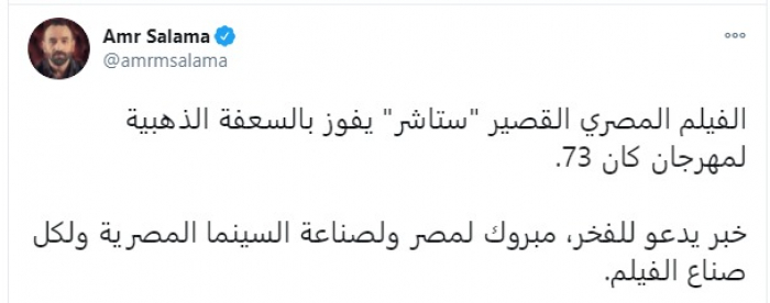 وغرد "سلامة" حول الفيلم عبر "تويتر"، قائلا: "الفيلم المصري القصير "ستاشر" يفوز بالسعفة الذهبية لمهرجان كان 73، خبر يدعو للفخر، مبروك لمصر ولصناعة السينما المصرية ولكل صناع الفيلم".