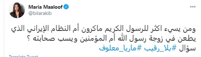وقالت في تغريدة عبر "تويتر" رصدها "المشهد العربي": "ومن يسيء أكثر للرسول الكريم ماكرون أم النظام الإيراني الذي يطعن في زوجة رسول الله أم المؤمنين ويسب صحابته؟".