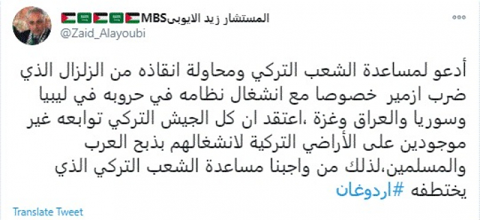 وقال في تغريدة عبر "تويتر" رصدها "المشهد العربي": "أدعو لمساعدة الشعب التركي ومحاولة إنقاذه من الزلزال الذي ضرب أزمير خصوصًا مع انشغال نظامه في حروبه في ليبيا وسوريا والعراق وغزة".