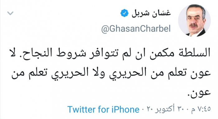 وكتب شربل في تغريدة له عبر حسابه بتويتر ورصدها "المشهد العربي": "السلطة مكمن إن لم تتوافر شروط النجاح"، مضيفا "لا عون تعلم من الحريري ولا الحريري تعلم من عون".