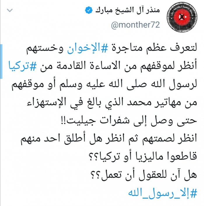 وكتب آل شيخ المبارك عبر تغريدة له على "تويتر" رصدها " المشهد العربي" :"لتعرف عظم متاجرة الإخوان وخستهم أنظر لموقفهم من الاساءة القادمة من تركيا لرسول الله صلى الله عليه وسلم أو موقفهم من مهاتير محمد الذي بالغ في الاستهزاء حتى وصل إلى شفرات جيليت".