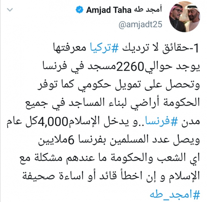وقال طه في تغريدة له عبر حسابه بتويتر ورصدها "المشهد العربي": "حقائق لا ترديك تركيا معرفتها يوجد حوالي 2260 مسجد في فرنسا وتحصل على تمويل حكومي كما توفر الحكومة أراضي لبناء المساجد في جميع مدن فرنسا..و يدخل الإسلام4,000كل عام ويصل عدد المسلمين بفرنسا 6ملايين".