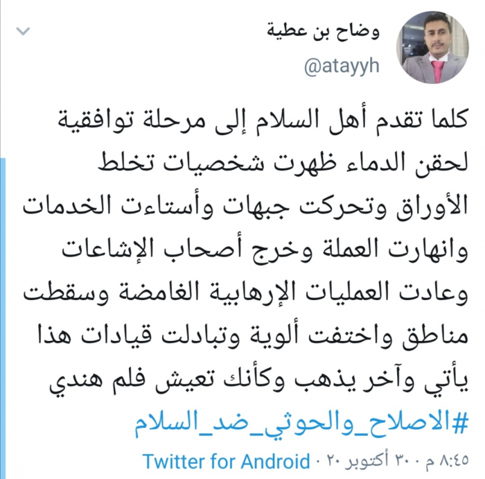 وقال بن عطية عبر تغريدة له على "تويتر" رصدها " المشهد العربي" "كلما تقدم أهل السلام إلى مرحلة توافقية لحقن الدماء ظهرت شخصيات تخلط الأوراق وتحركت جبهات وساءت الخدمات وانهارت العملة وخرج أصحاب الإشاعات وعادت العمليات الإرهابية الغامضة وسقطت مناطق واختفت ألوية وتبادلت قيادات هذا يأتي وآخر يذهب كأنك تعيش أحداث فيلم".