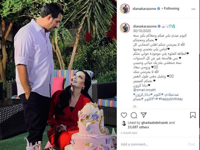 ونشرت ديانا، صورة لها مع زوجها بجانب التورتة، عبر حسابها على "إنستجرام" وعلقت: "اليوم عيدي يا اللي فيكم ومعاكم بكبر سنة.. بحبكم ومحبتكم، الله لا يحرمني منكم أهلي وأصحابي وكل الناس اللي بتحبني وبحبها.. الطاقة الحلوة اللي موجودة حوليا منكم".