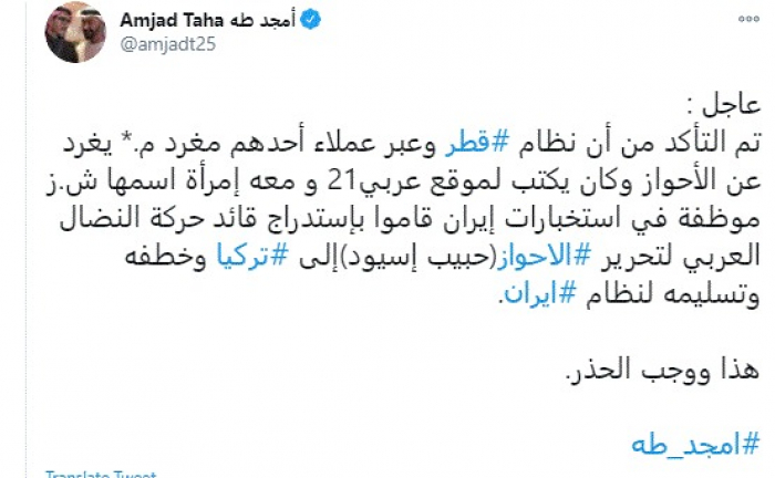 وقال في تغريدة عبر "تويتر" رصدها "المشهد العربي": "تم التأكد من أن نظام قطر وعبر عملاء أحدهم مغرد م.* يغرد عن الأحواز وكان يكتب لموقع عربي21 و معه إمرأة اسمها ش.ز موظفة في استخبارات إيران قاموا بإستدراج قائد حركة النضال العربي لتحرير الأحواز(حبيب إسيود)إلى تركيا وخطفه وتسليمه لنظام ايران هذا ووجب الحذر".