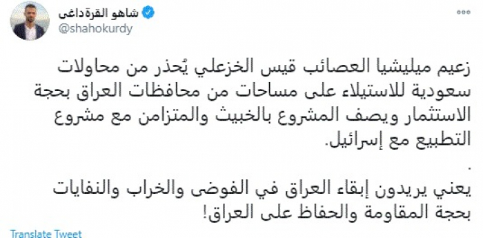 وقال في تغريدة عبر "تويتر" رصدها "المشهد العربي": "زعيم مليشيا العصائب قيس الخزعلي يُحذر من محاولات سعودية للاستيلاء على مساحات من محافظات العراق بحجة الاستثمار ويصف المشروع بالخبيث والمتزامن مع مشروع التطبيع مع إسرائيل. يعني يريدون إبقاء العراق في الفوضى والخراب والنفايات بحجة المقاومة والحفاظ على العراق".