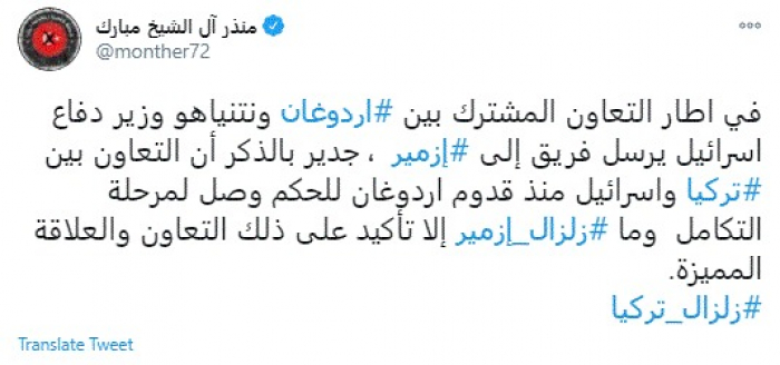 قال المدون السعودي البارز منذر آل الشيخ مبارك، اليوم، إن زلزال إزمير فضح العلاقات بين تركيا وإسرائيل.