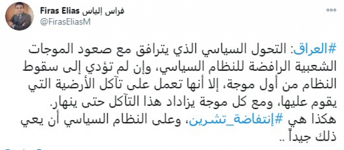 وقال في تغريدة عبر "تويتر" رصدها "المشهد العربي": "العراق: التحول السياسي الذي يترافق مع صعود الموجات الشعبية الرافضة للنظام السياسي، وإن لم تؤدي إلى سقوط النظام من أول موجة، إلا أنها تعمل على تآكل الأرضية التي يقوم عليها، ومع كل موجة يزاداد هذا التآكل حتى ينهار.هكذا هي انتفاضة تشرين، وعلى النظام السياسي أن يعي ذلك جيداً".