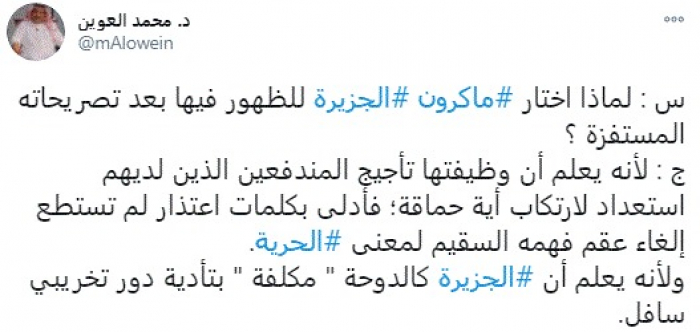 وقال في تغريدة عبر "تويتر" رصدها "المشهد العربي": "لماذا اختار ماكرون الجزيرة للظهور فيها بعد تصريحاته المستفزة؟ لأنه يعلم أن وظيفتها تأجيج المندفعين الذين لديهم استعداد لارتكاب أية حماقة؛ فأدلى بكلمات اعتذار لم تستطع إلغاء عقم فهمه السقيم لمعنى الحرية. ولأنه يعلم أن #الجزيرة كالدوحة " مكلفة " بتأدية دور تخريبي ...".