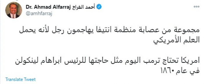 وكتب في تغريدة عبر "تويتر" رصدها "المشهد العربي": "مجموعة من عصابة منظمة انتيفا يهاجمون رجل لأنه يحمل العلم الأمريكي أمريكا تحتاج ترمب اليوم مثل حاجتها للرئيس ابراهام لينكولن في عام ١٨٦٠".