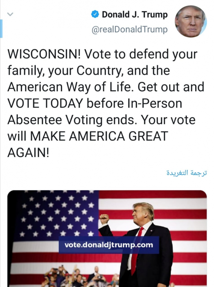 وغرد ترامب عبر حسابه بتويتر ورصدها "المشهد العربي":" صوّت للدفاع عن أسرتك وبلدك وطريقة الحياة الأمريكية. أخرج وصوِّت اليوم قبل انتهاء التصويت الشخصي الغيابي. تصويتك سيجعل أمريكا عظيمة مرة أخرى".
