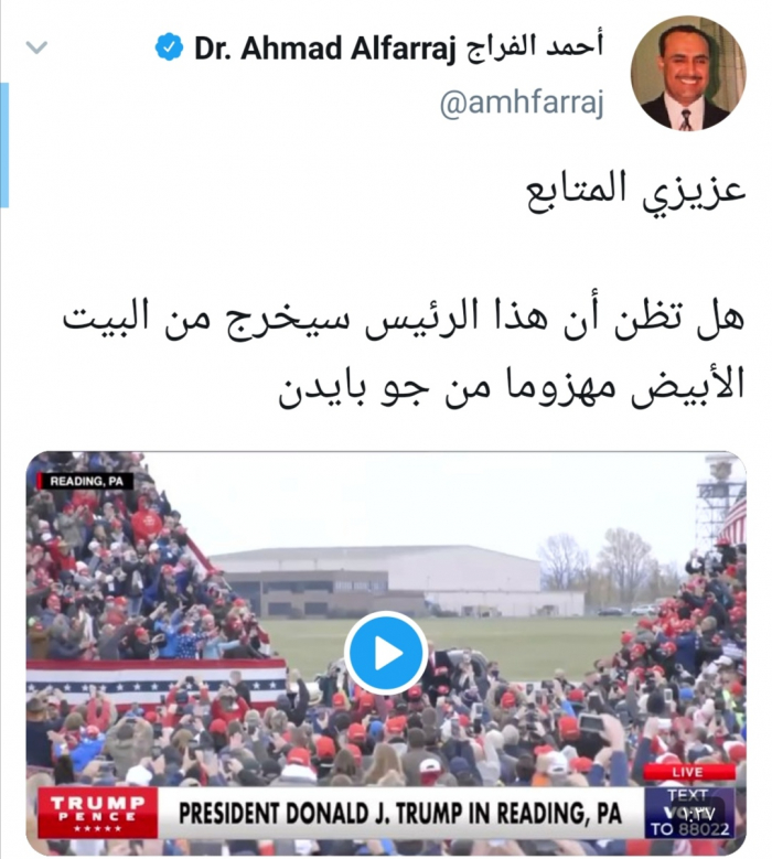 وقال الفراج عبر تغريدة له على حسابه بتويتر ورصدها "المشهد العربي" : "عزيزي المتابع.. هل تظن أن هذا الرئيس سيخرج من البيت الأبيض مهزوما من جو بايدن".