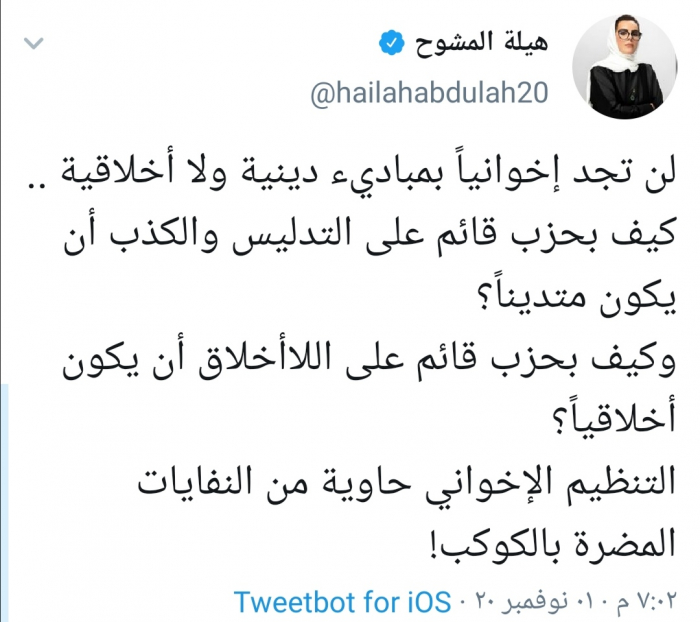 وكتبت المشوح عبر حسابها بتويتر رصدها " المشهد العربي": "لن تجد إخوانياً بمباديء دينية ولا أخلاقية".