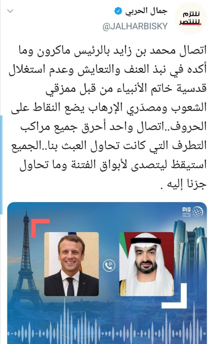 وكتب الحربي في تغريدة له عبر حسابه بتويتر ورصدها "المشهد العربي" :"اتصال محمد بن زايد بالرئيس ماكرون وما أكده في نبذ العنف والتعايش وعدم استغلال قدسية خاتم الأنبياء من قبل ممزقي الشعوب ومصدّري الإرهاب يضع النقاط على الحروف".