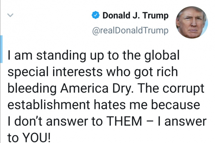 ونشر ترامب في تغريدة له عبر حسابه بتويتر ورصدها "المشهد العربي" "إنني أقف في وجه المصالح الخاصة العالمية، والمؤسسة الفاسدة تكرهني لأنني لا أرد عليهم".