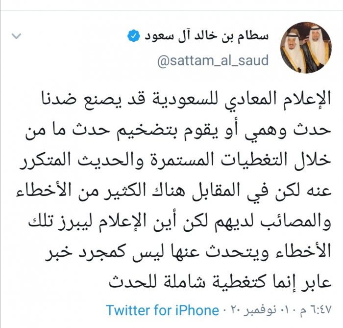 وقال آل سعود في تغريدة له عبر حسابه بتويتر ورصدها "المشهد العربي": "الإعلام المعادي للسعودية قد يصنع ضدنا حدث وهمي أو يقوم بتضخيم حدث ما من خلال التغطيات المستمرة والحديث المتكرر عنه".
