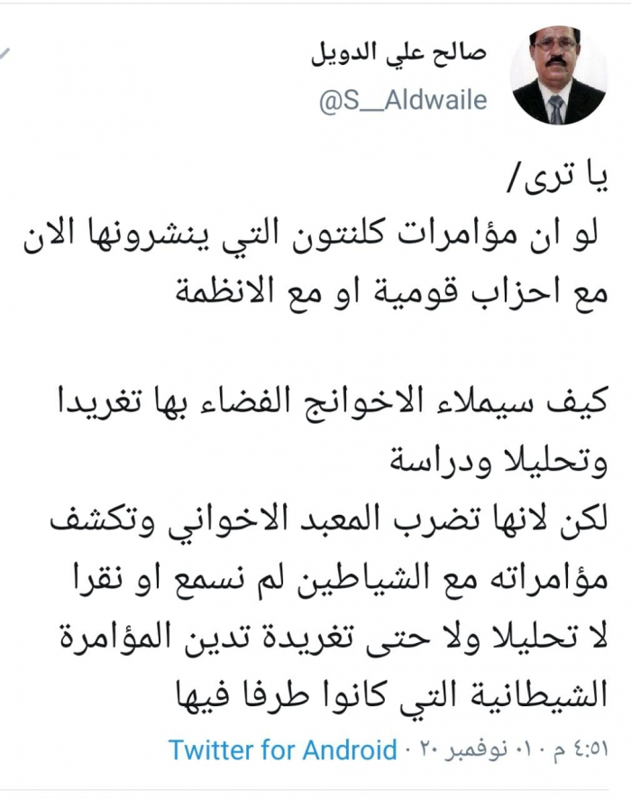 وقال علي الدويل في تغريدة له عبر "تويتر" رصدها "المشهد العربي": " يا ترى لو أن مؤامرات كلينتون التي ينشرونها الآن مع أحزاب قومية أو مع الأنظمة، كيف سيملأ الإخوانج الفضاء بها تغريدا وتحليلا ودراسة".