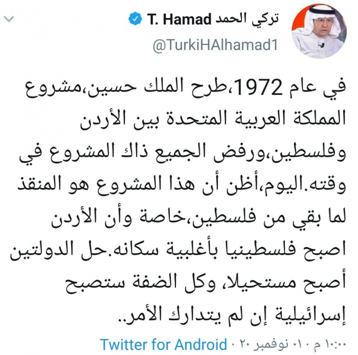 وأضاف الحمد في تغريدة له عبر حسابه بتويتر ورصدها "المشهد العربي" أن "اليوم أظن أن هذا المشروع هو المنقذ لما بقي من فلسطين، خاصة وأن الأردن أصبح فلسطينيا بأغلبية سكانه".