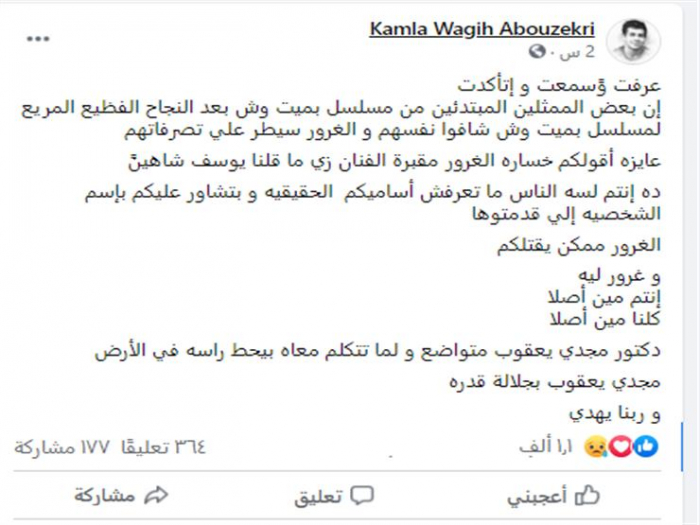 وكتبت: "عرفت وًسمعت و إتأكدت، إن بعض الممثلين المبتدئين من مسلسل بـ 100 وش، بعد النجاح الفظيع المريع للمسلسل شافوا نفسهم، والغرور سيطر على تصرفاتهم".