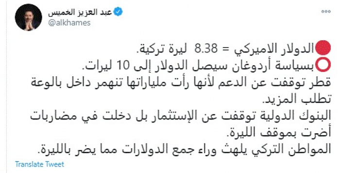 وقال في تغريدة عبر "تويتر" رصدها "المشهد العربي": "الدولار الأميركي = 8.38 ليرة تركية. بسياسة أردوغان سيصل الدولار إلى 10 ليرات. قطر توقفت عن الدعم لأنها رأت ملياراتها تنهمر داخل بالوعة تطلب المزيد".