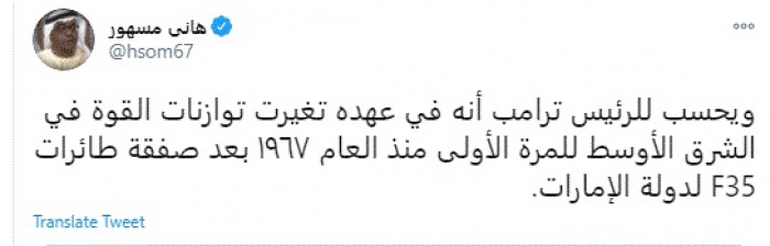 وقال في تغريدة عبر "تويتر" رصدها "المشهد العربي": "ويحسب للرئيس ترامب أنه في عهده تغيرت توازنات القوة في الشرق الأوسط للمرة الأولى منذ العام ١٩٦٧ بعد صفقة طائرات F35 لدولة الإمارات".