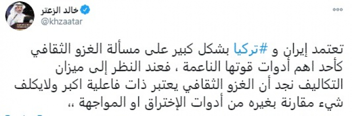 وكتب في تغريدة عبر "تويتر" رصدها "المشهد العربي": "تعتمد إيران وتركيا بشكل كبير على مسألة الغزو الثقافي كأحد أهم أدوات قوتها الناعمة، فعند النظر إلى ميزان التكاليف نجد أن الغزو الثقافي يعتبر ذات فاعلية أكبر ولا يكلف شيء مقارنة بغيره من أدوات الإختراق او المواجهة".