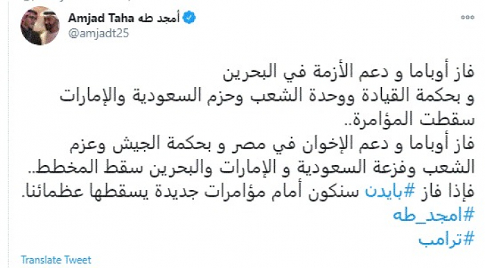 وأضاف: "فاز أوباما و دعم الإخوان في مصر و بحكمة الجيش وعزم الشعب وفزعة السعودية والإمارات والبحرين سقط المخطط.. فإذا فاز بايدن سنكون أمام مؤامرات جديدة يسقطها عظمائنا".