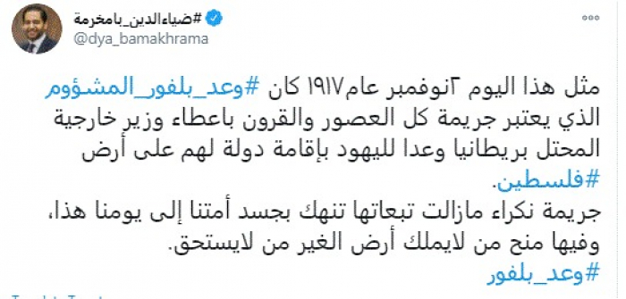وقال في تغريدة عبر "تويتر" رصدها "المشهد العربي": "مثل هذا اليوم ٢ نوفمبر عام ١٩١٧ كان وعد بلفور المشؤوم الذي يعتبر جريمة كل العصور والقرون بإعطاء وزير خارجية المحتل بريطانيا وعدا لليهود بإقامة دولة لهم على أرض فلسطين".